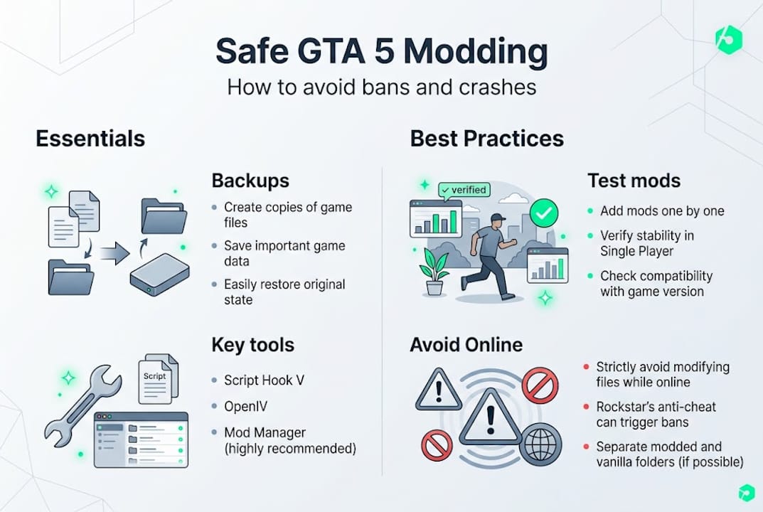 Never launch GTA Online with mods active. Story mode only. This single rule prevents 95% of all modding bans.